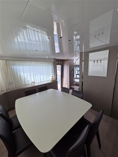 The main deck layout of the SX76 motor yacht features a seamless open-plan configuration, perfectly connecting the cockpit with the aft living area.